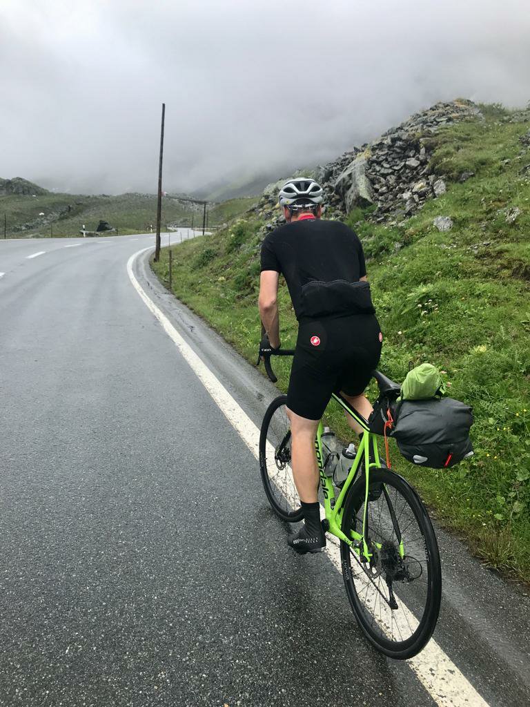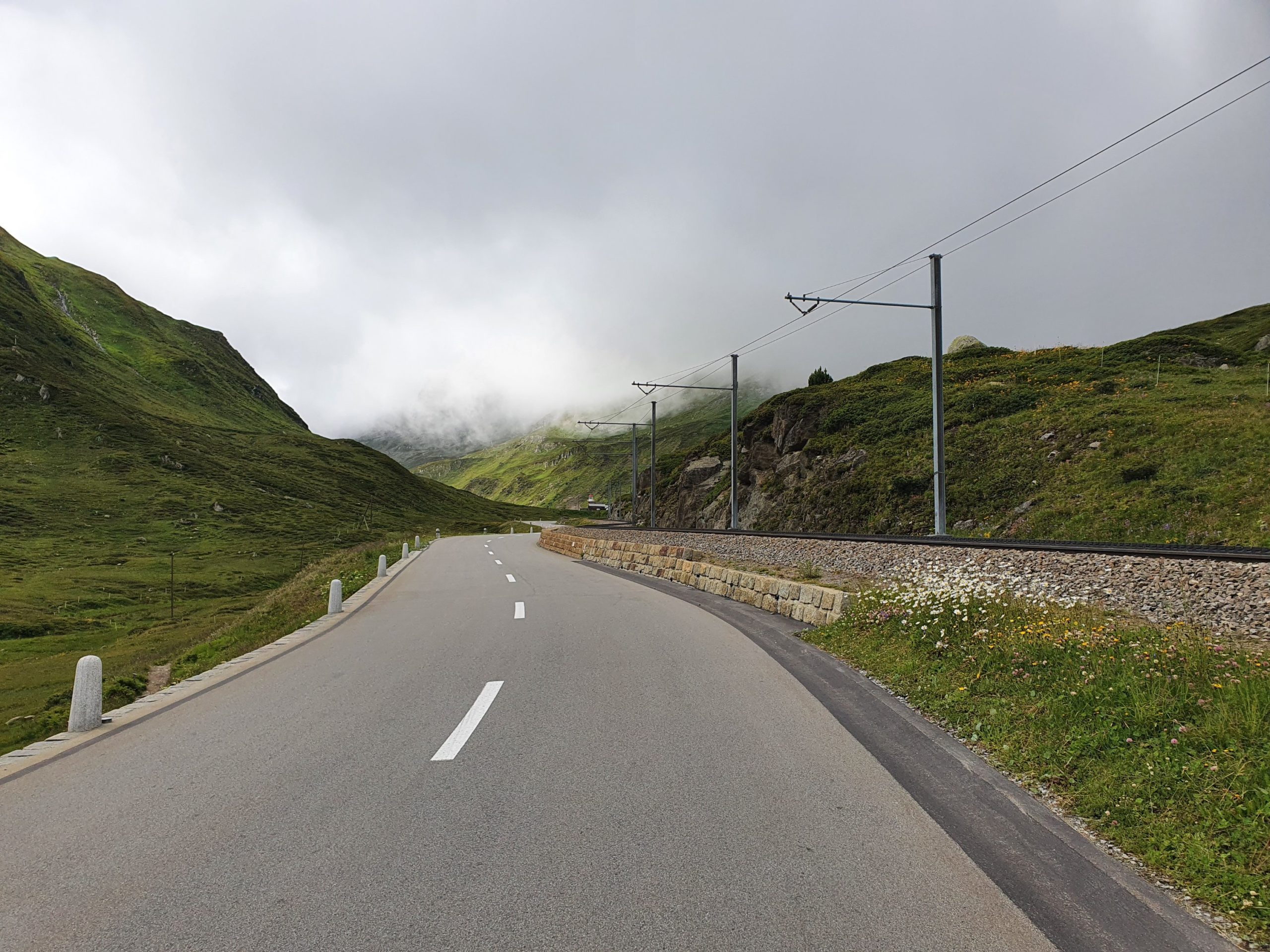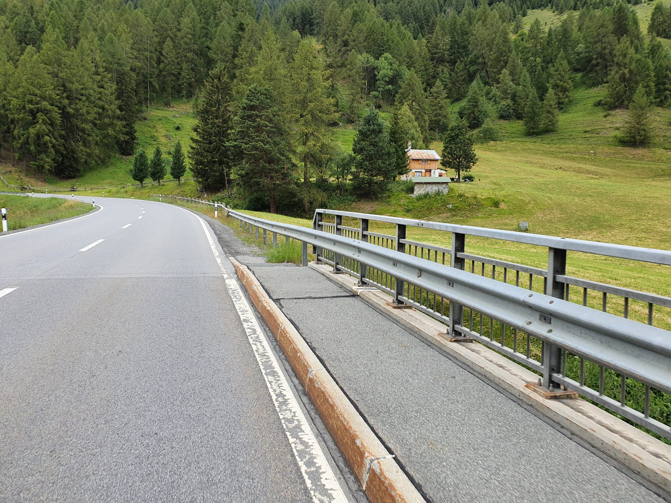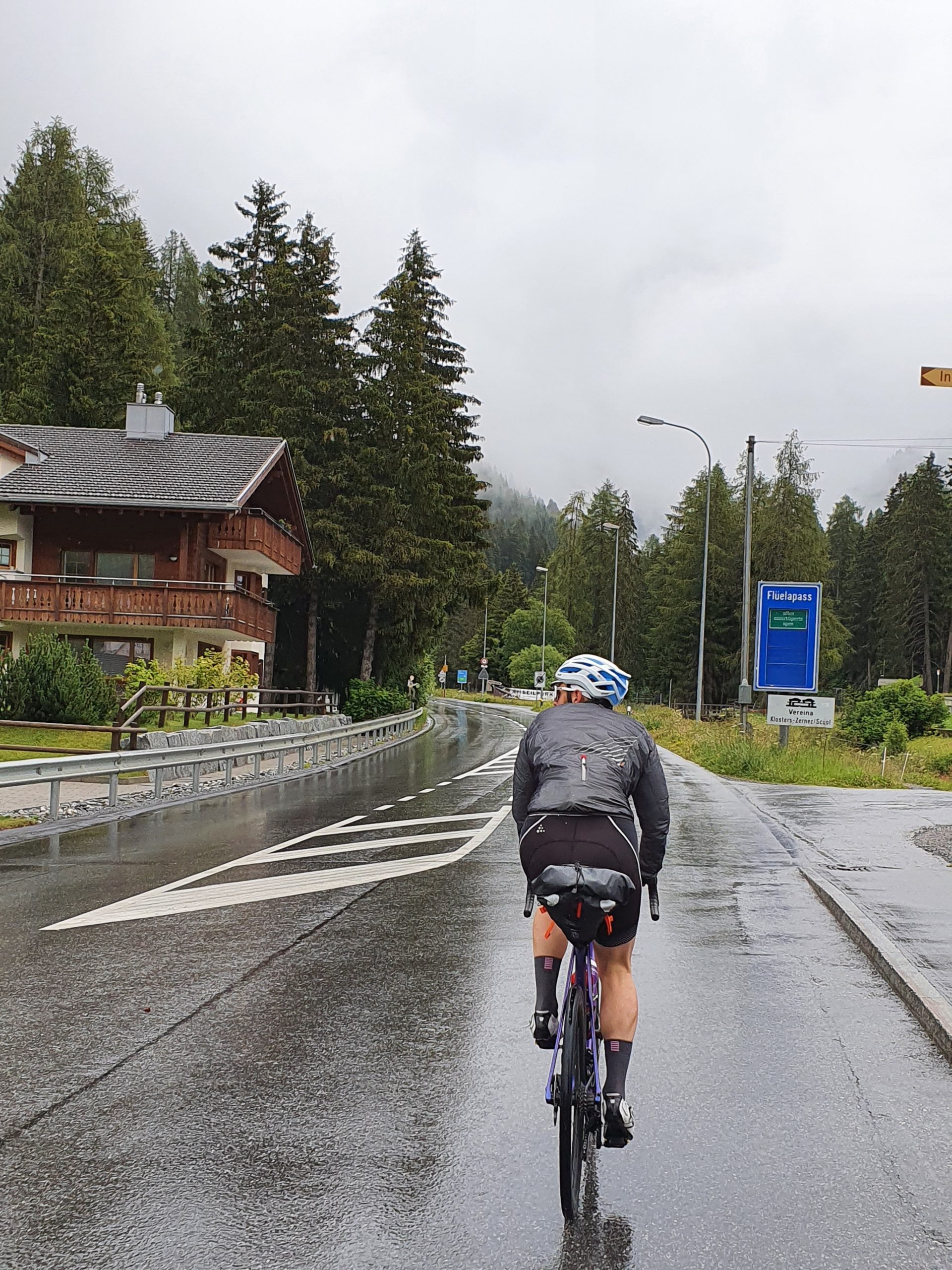 On a donc attaqué la Fluela sous la pluie mais content d’avoir pu réparer ce vélo. L’ascension fût sans histoire. Un café au sommet, vieux journaux sous la veste et descente sur Zernez.