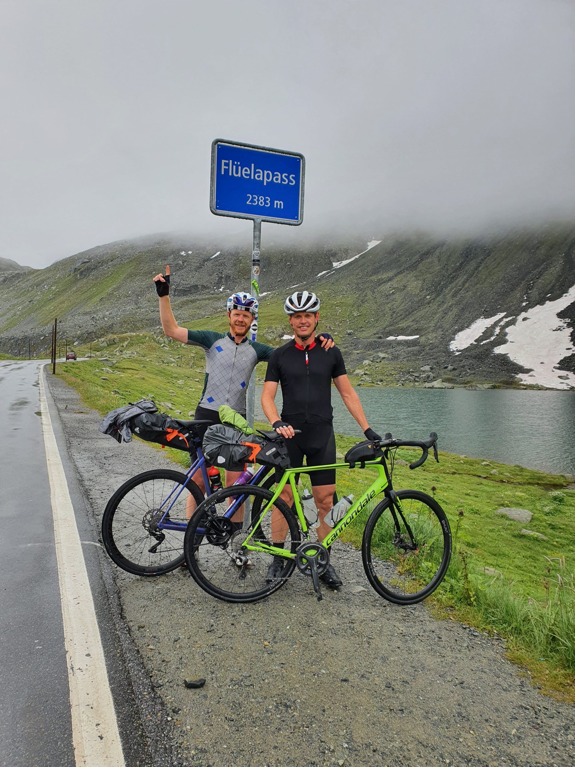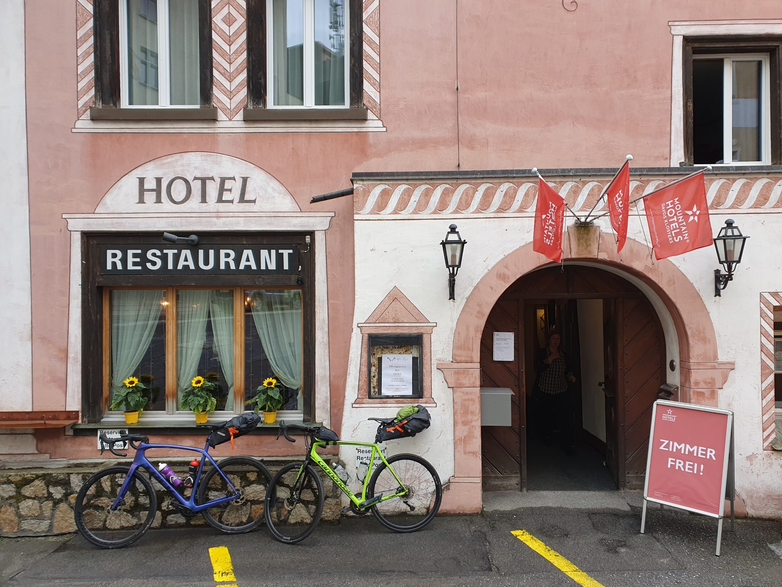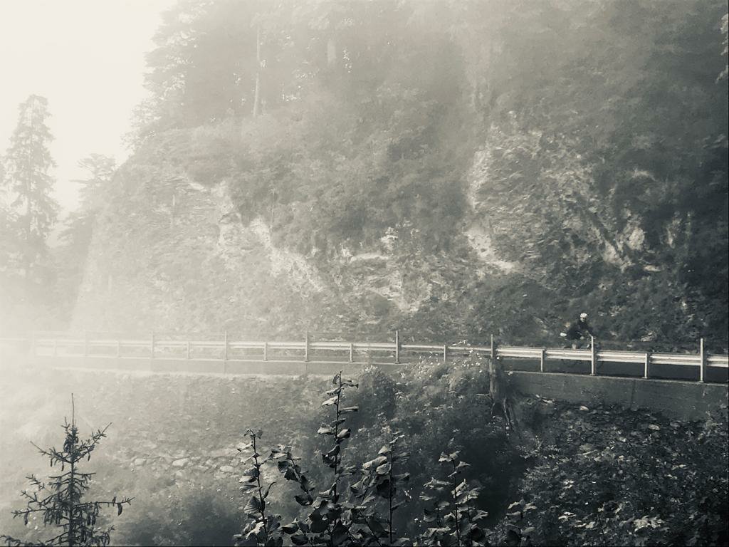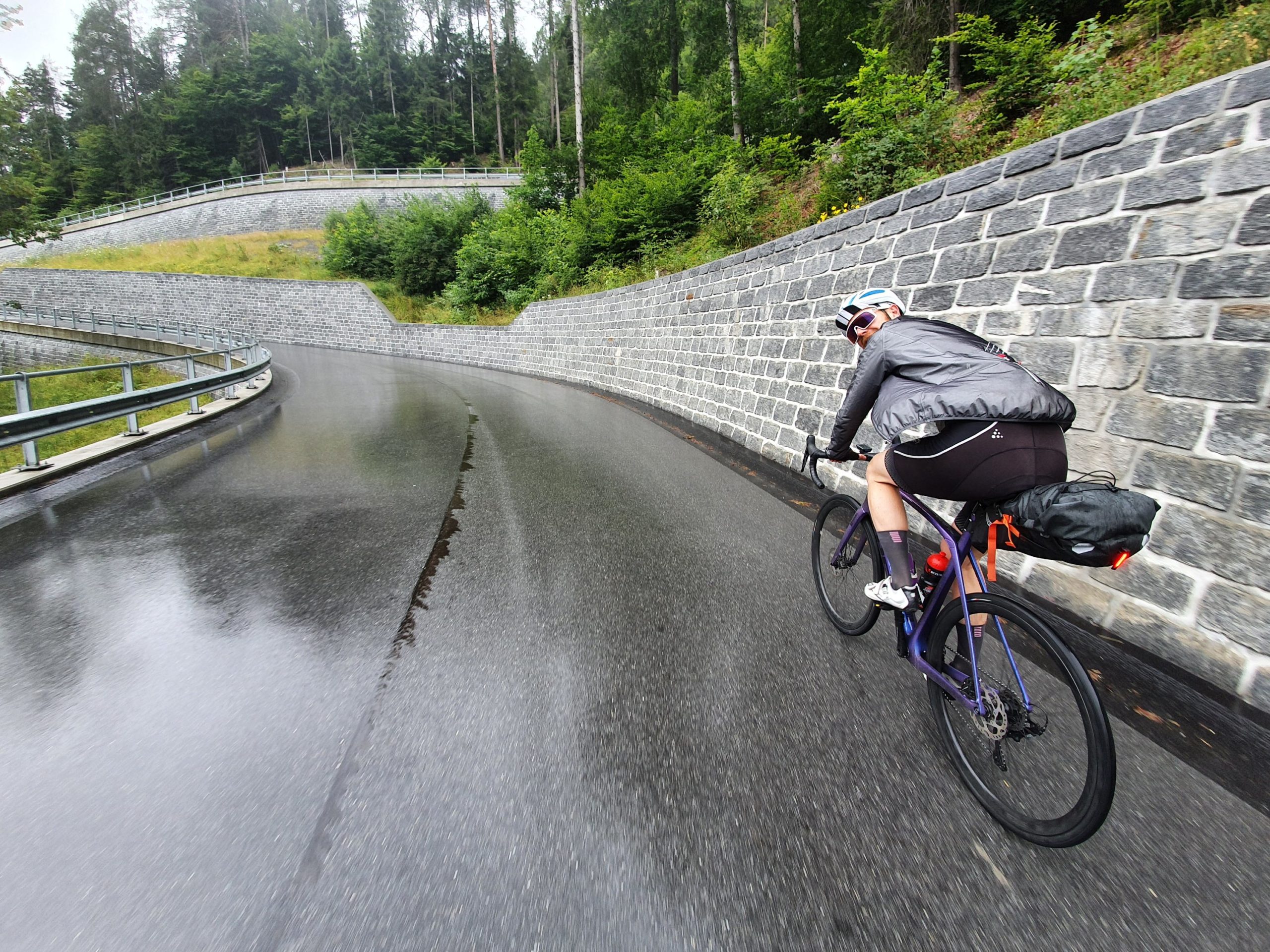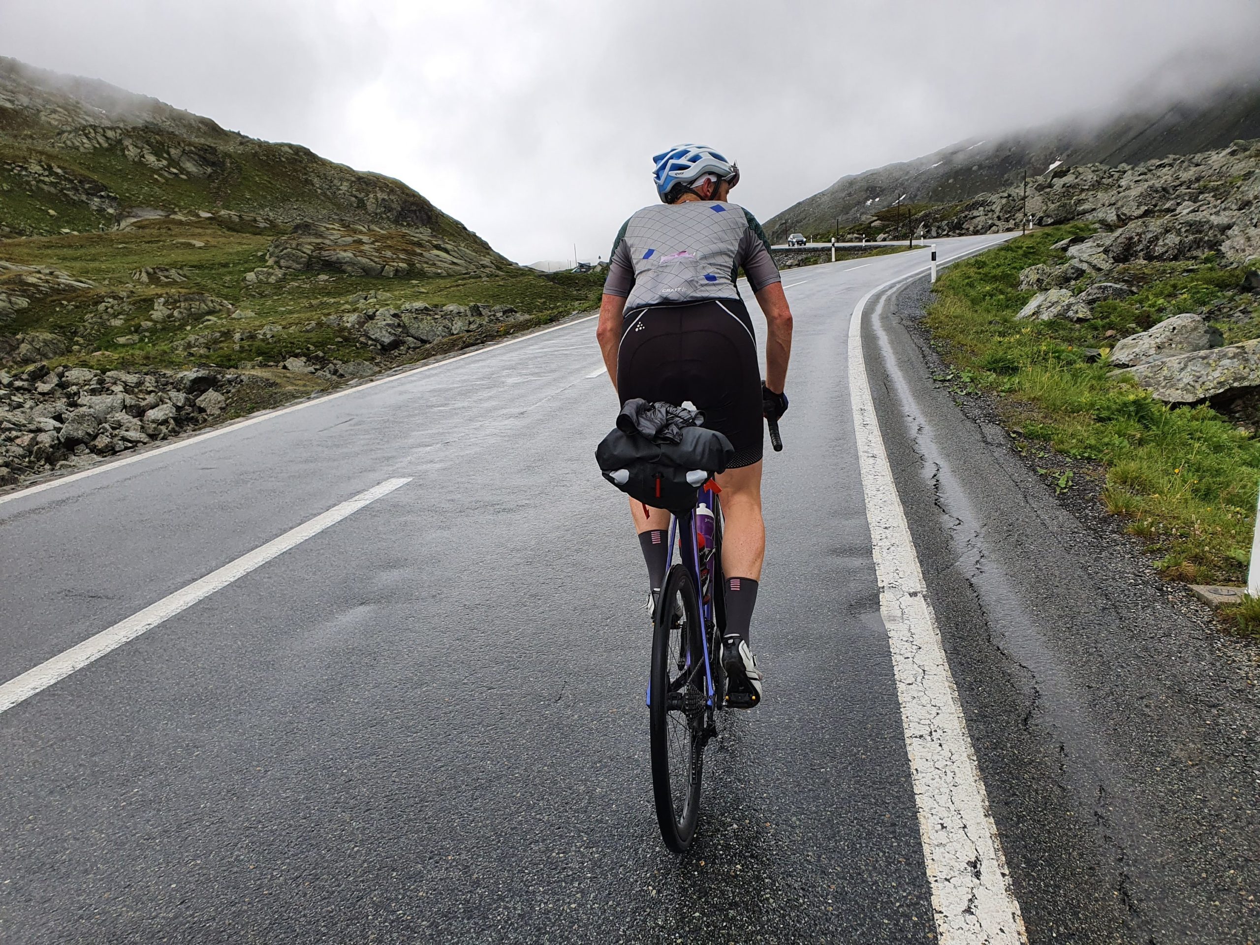 On a donc attaqué la Fluela sous la pluie mais content d’avoir pu réparer ce vélo. L’ascension fût sans histoire. Un café au sommet, vieux journaux sous la veste et descente sur Zernez.