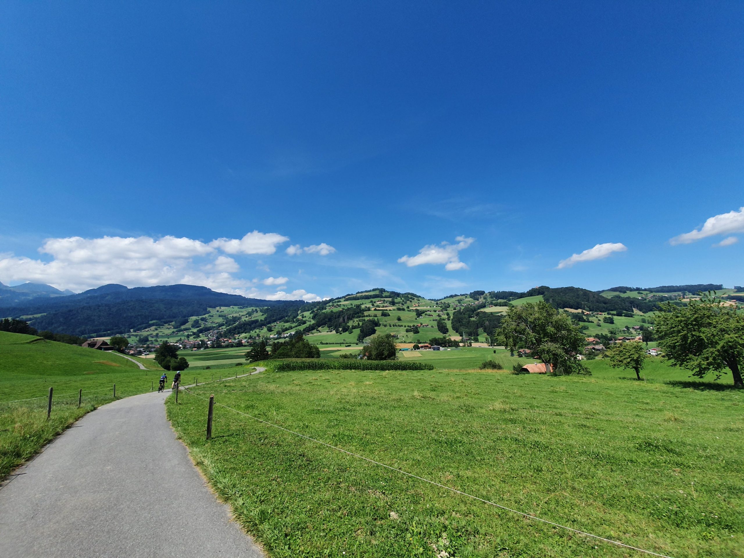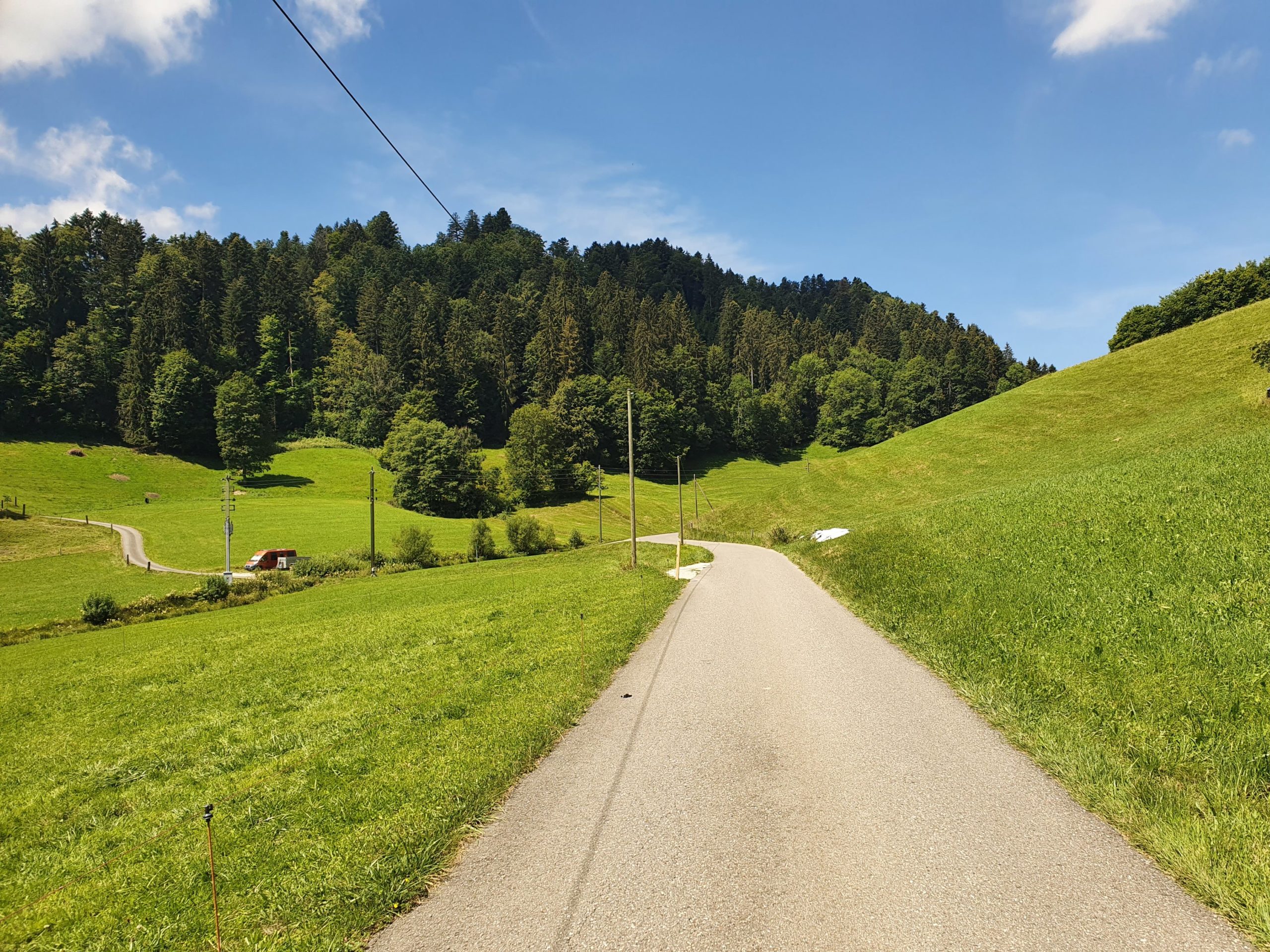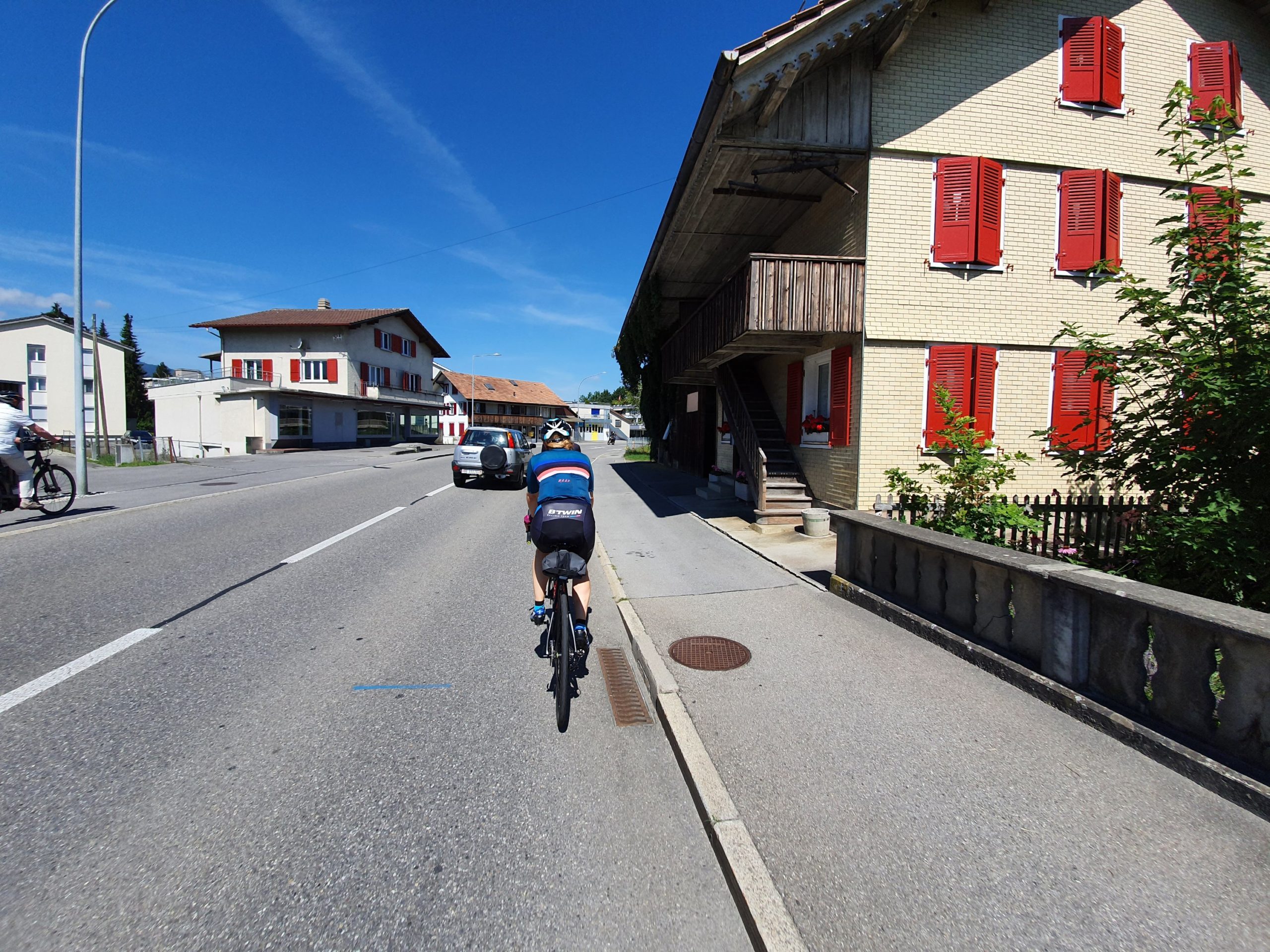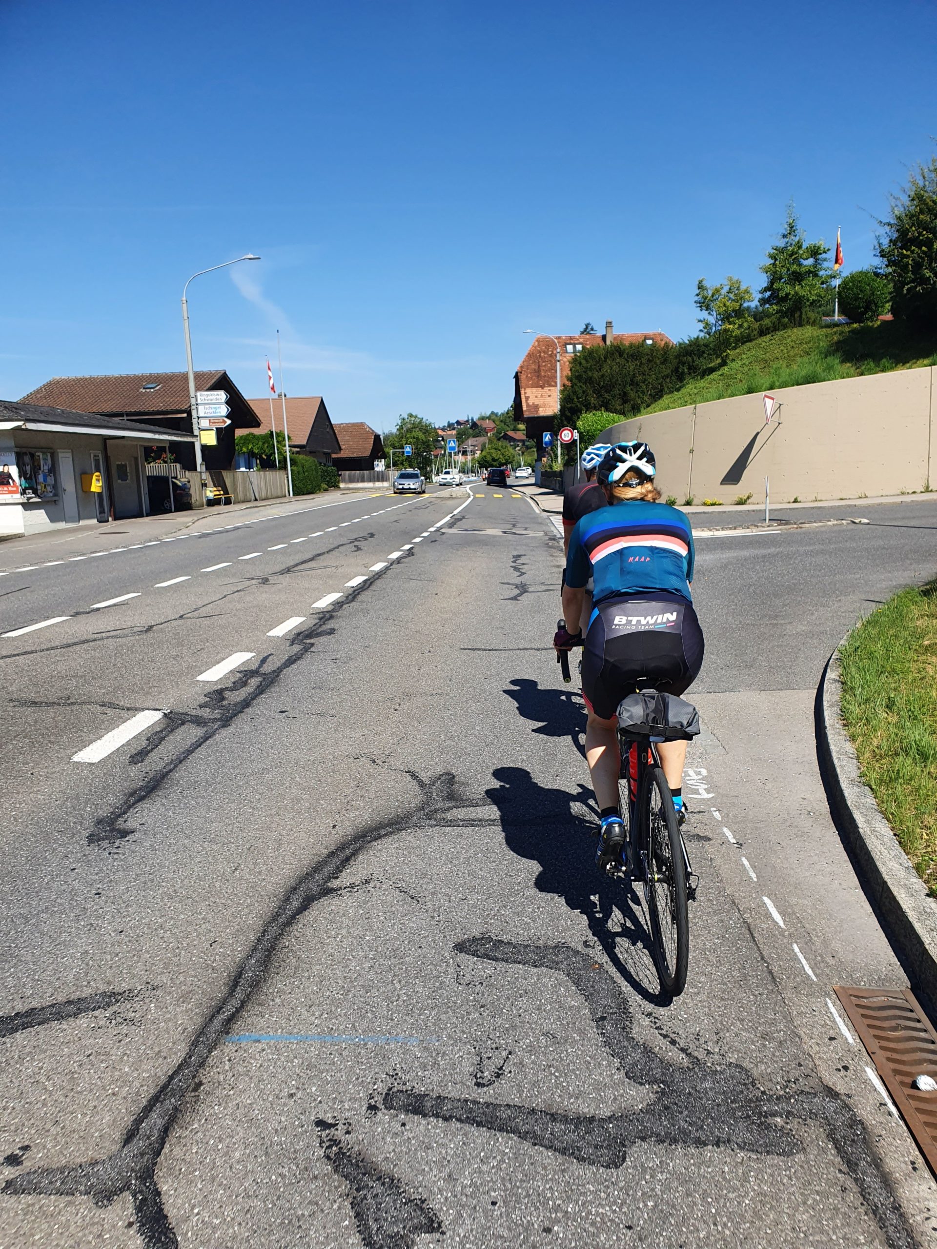 Un café dans la banlieue de Thoune, avant d’attaquer la partie pentue de la journée. Les jolies fermes et les champs à perte de vue sont un décor idéal pour attaquer cette première côte.