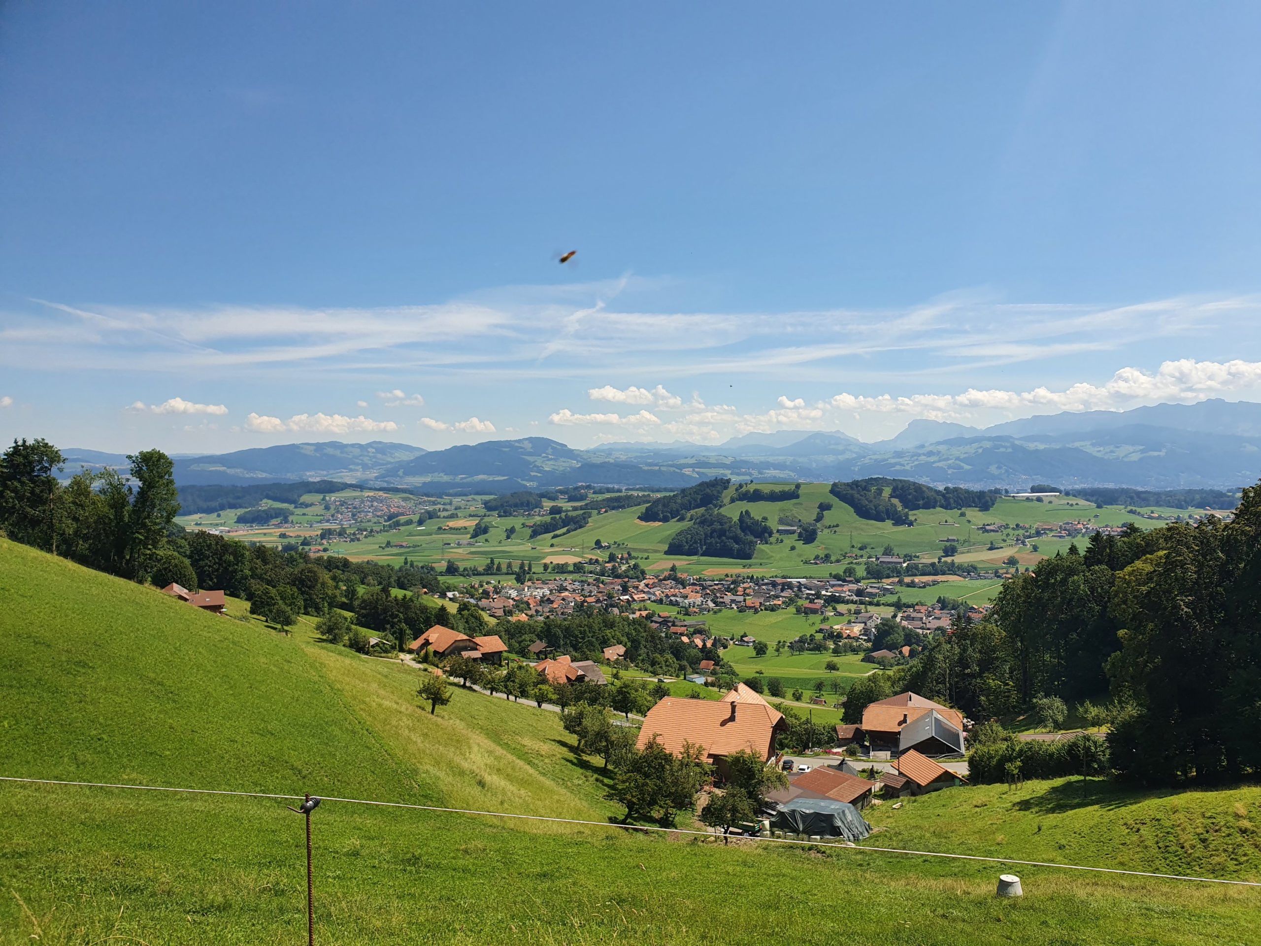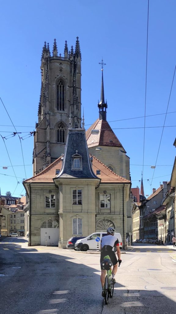 Je bouclerai donc ce projet en compagnie d’Anne-Sophie. On traverse la campagne fribourgeoise au loin on distingue le pont, la cathédrale, Fribourg est pas loin.