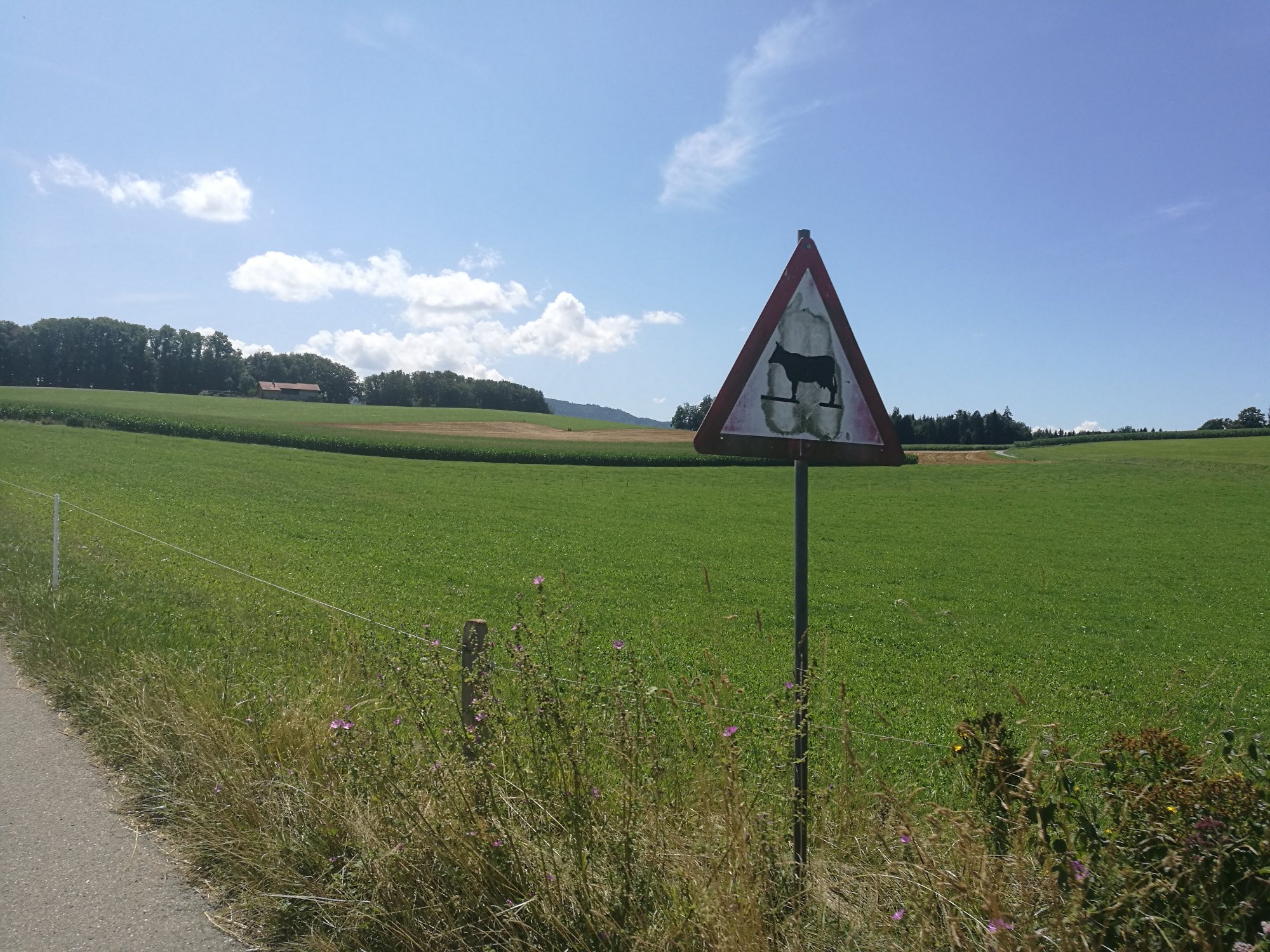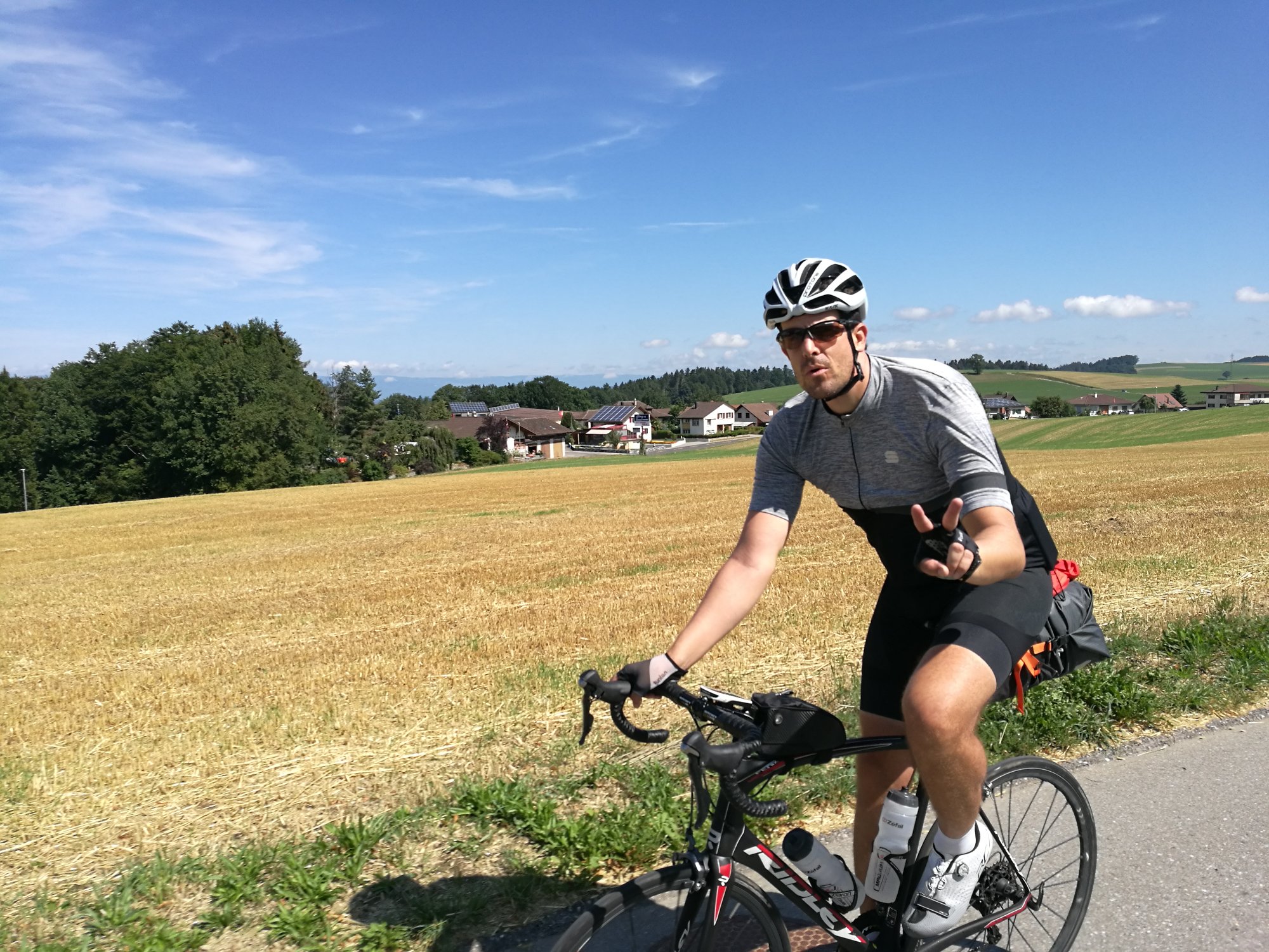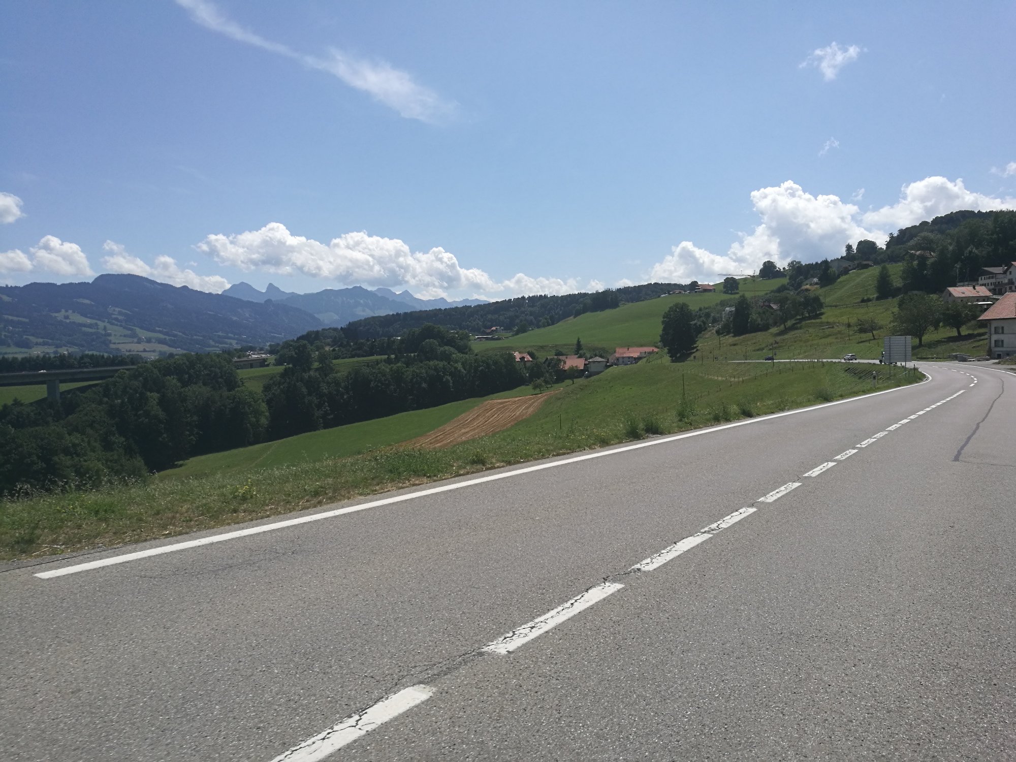 C’est le départ de la dernière étape. Le ciel est radieux, on traverse les flancs herbeux du canton de Fribourg. On passe au pied du château du Gruyère.